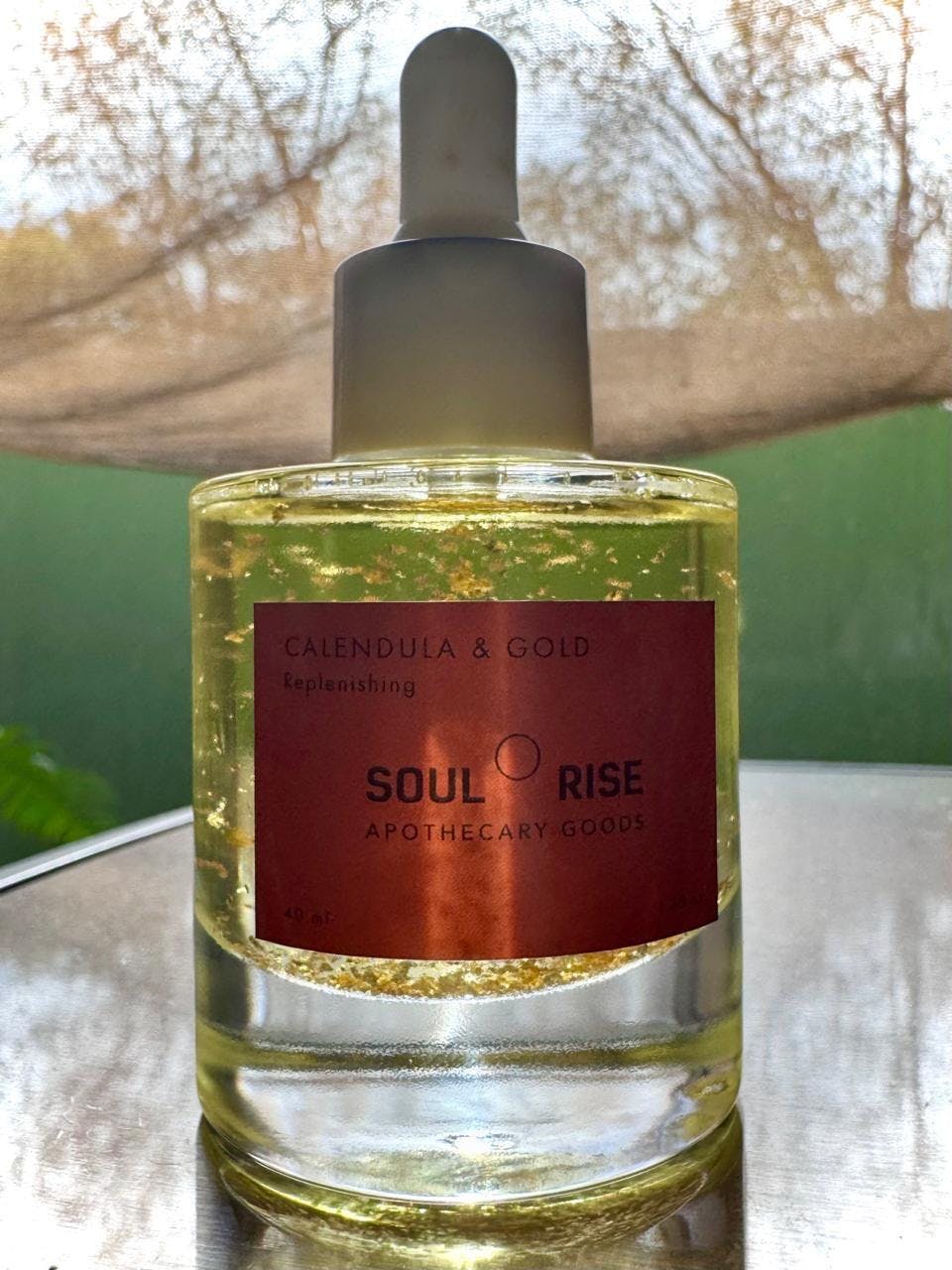 Inspirado en la unión entre la tierra y la luz, este aceite facial y corporal combina el poder restaurador de la caléndula, el resplandor revitalizante del oro 24K y la serenidad aromática de la lavanda orgánica.